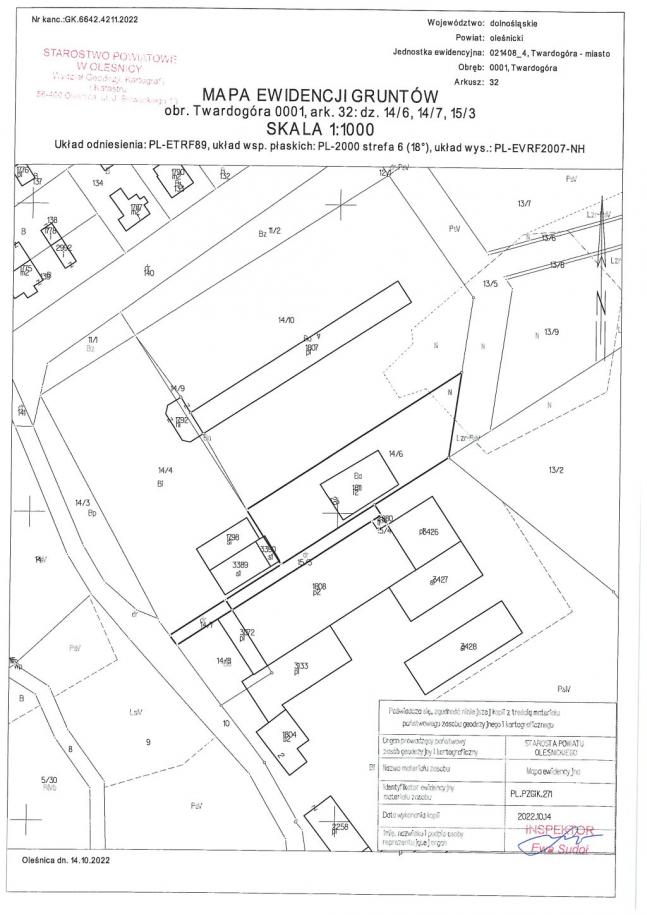 1) nieruchomości oznaczonej jako: nieruchomość gruntowa, działka gruntu nr 14/6 o pow. 0,1550 ha - tereny przemysłowe położonej w miejscowości Twardogóra ul. Długa 2B stanowiącej własność dłużnika posiadająca założoną księgę wieczystą w Wydziale Ksiąg Wieczystych Sądu Rejonowego w Oleśnicy nr WR1E/00101090/9.